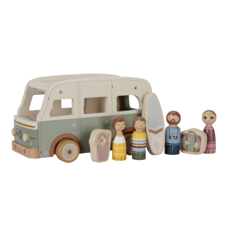 expand_more Více informacíNaskočte do obytného vozu a připravte se na den na pláži nebo rodinný výlet. Nezapomeňte si sbalit kufr, plážovou tašku a surf! Střechu tohoto vintage dřevěného obytného vozu lze odejmout, aby se dovnitř snadno dostaly čtyři malé dřevěné figurky. Zadní dveře se otevírají a umožňují uložení zavazadel v zadní části obytného vozu.