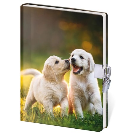 Památník se zámkem s motivem štěňátek o rozměru 13x18 cm s 60 čistými listy. Památník je šitý, s kulatým hřbetem a pevnými deskami.