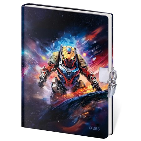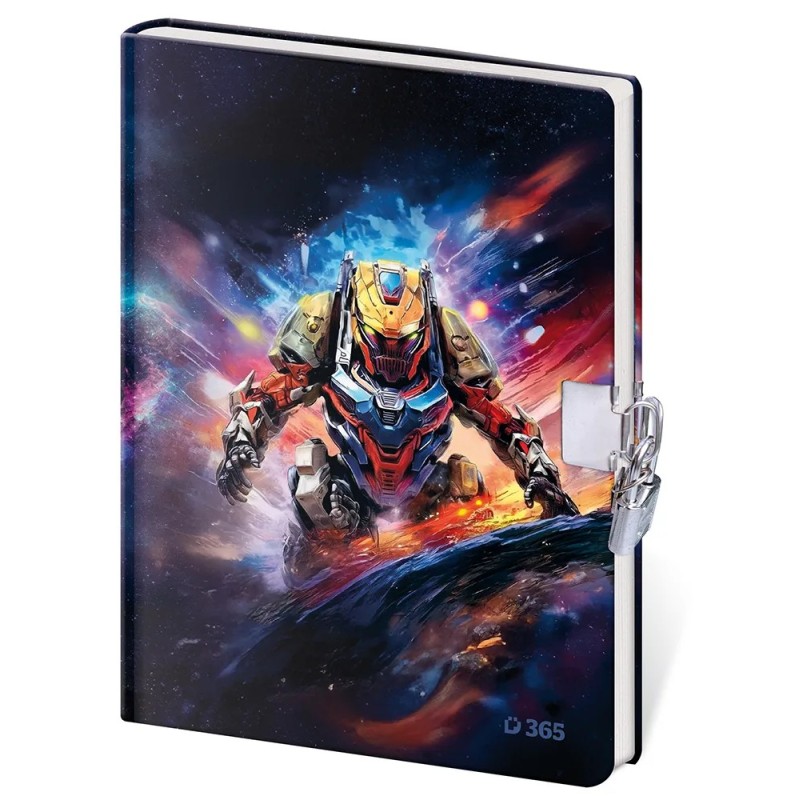 Památník se zámkem s klučičím motivem o rozměru 13x18 cm s 60 čistými listy. Památník je šitý, s kulatým hřbetem a pevnými deskami.