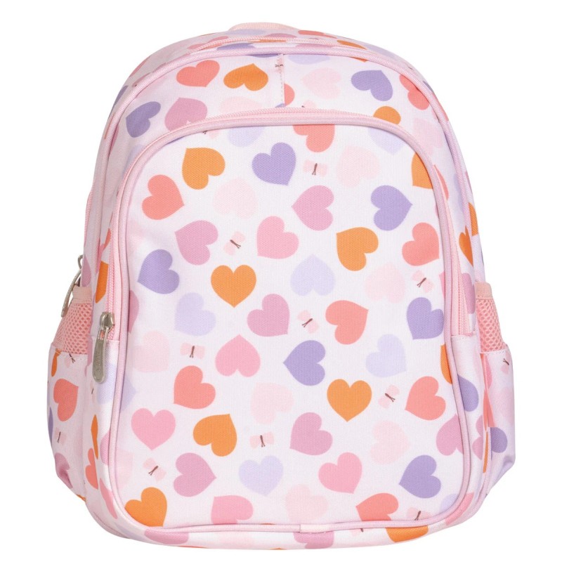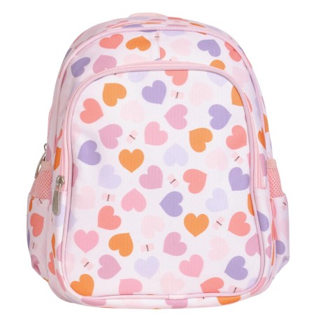 Prostorný dětský batoh s motivem srdíček je ideální do školky nebo na cesty. Batoh pro děti má prostornou hlavní komoru, izolovanou přední kapsu na svačinu a nápoje. Láhev na pití se vejde do jedné ze dvou bočních kapes. Praktické jsou polstrované ramenní popruhy a hrudní popruh proti sklouznutí z ramen. Zadní panel je polstrovaný pro větší pohodlí a je vybaven prodyšnou tkaninou.