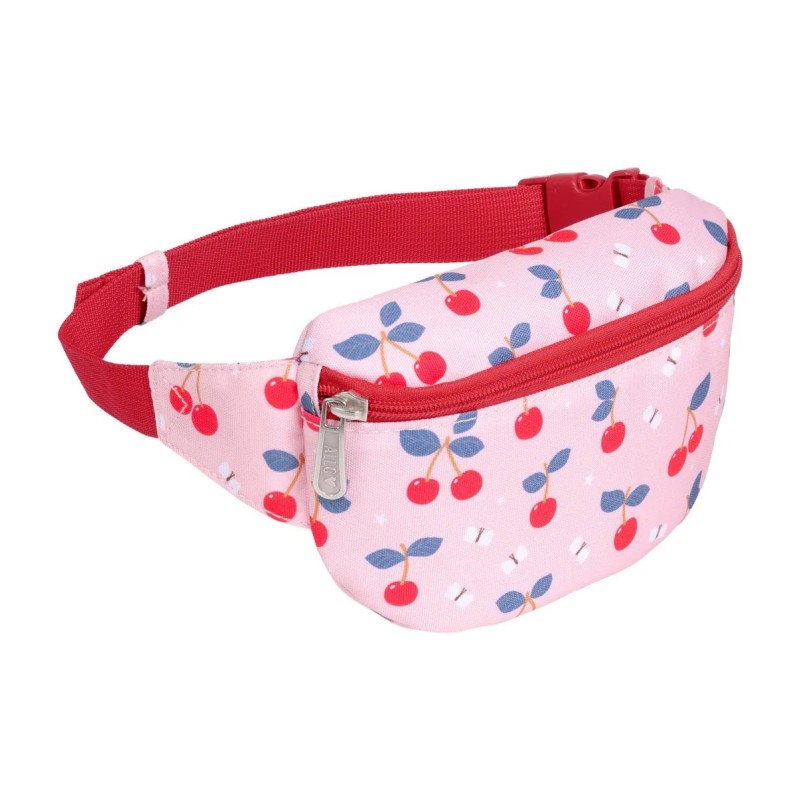 Dětská růžová ledvinka s potiskem třešní má nastavitelný popruh. Dá se nosit kolem pasu a lze jí použít i přes rameno jako crossbody kabelku.