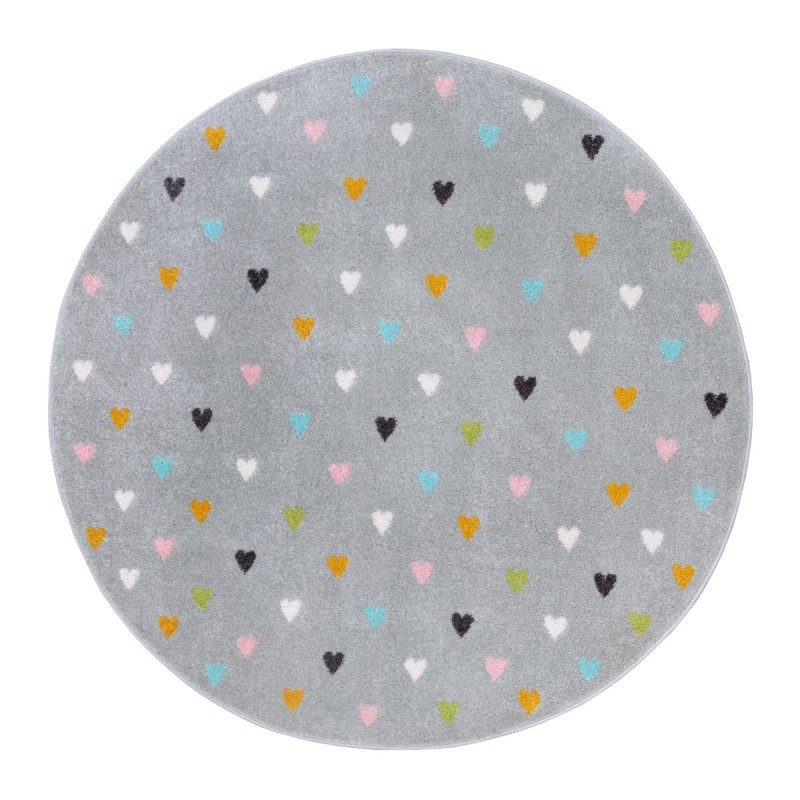 Šedý kruhový koberec s různobarevnými srdíčky přinese hravost do každého dětského pokoje. Měkký, ale odolný povrch ze 100% polypropylenového vlákna je ideální pro každodenní hraní. Středně vysoký střižený vlas zajišťuje pohodlí, zatímco obšití po obvodu prodlužuje jeho životnost. Výška vlasu: 5 mm.