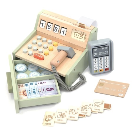 Hotově nebo kartou? Díky této dřevěné sadě s pokladnou, penězi, platební kartou a terminálem si děti mohou vyzkoušet roli prodavače i zákazníka. Zažijí tak nanečisto mnohá dobrodružství, které je v budoucnu v reálném světě teprve čekají.