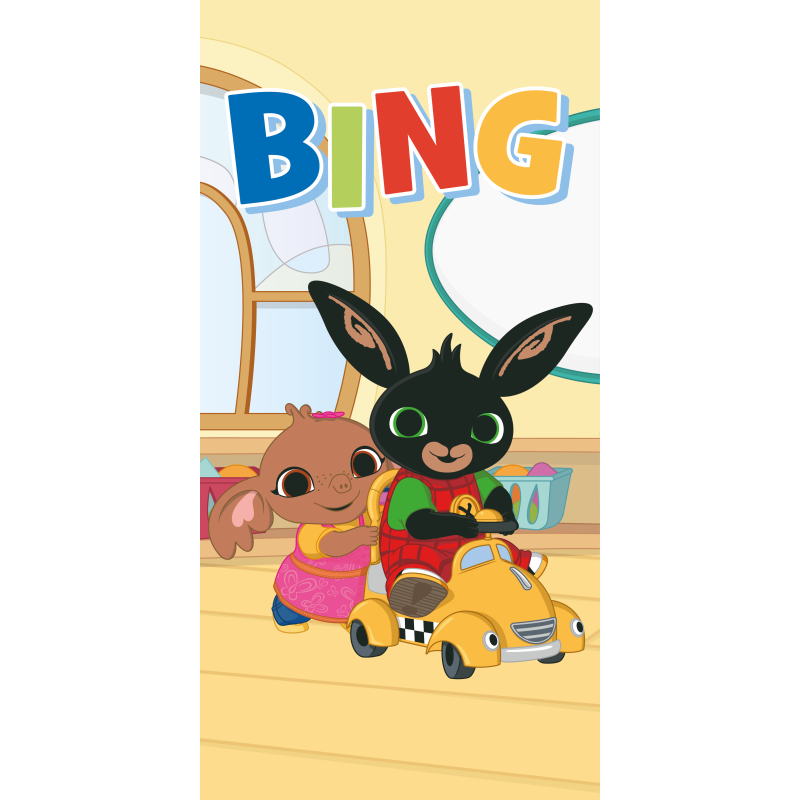 Dětská osuška Králíček Bing Playroom ze 100% bavlny, rozměr 70×140 cm. Veselý motiv Binga a Suly v herně. Měkká, savá a ideální pro děti doma, na pláži i u bazénu!
