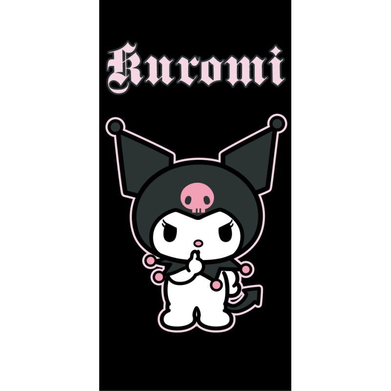 Dětská osuška Kuromi z 100% bavlny, rozměr 70×140 cm. Stylový černý design s motivem oblíbené postavičky Kuromi. Měkká, savá a ideální pro koupelnu, bazén i pláž!