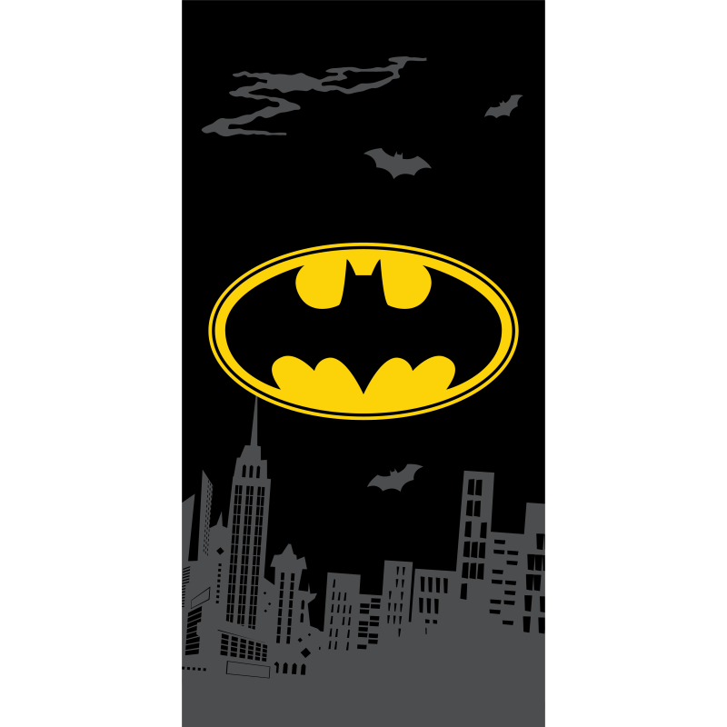 Dětská osuška Batman The Emblem 70×140 cm z kvalitní 100% bavlny. Černý podklad s ikonickým žlutým znakem Batmana a siluetou města Gotham. Měkká, savá a ideální na doma, k bazénu i na dovolenou.