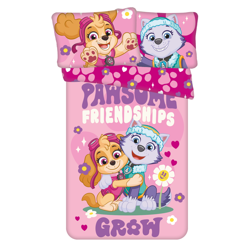expand_more Více informacíRoztomilé povlečení s motivem Skye a Everest z Tlapkové patroly na růžovém pozadí s květinami potěší každou malou faninku. Nápis „Pawsome Friendships Grow“ dodává povlečení pozitivní nádech.