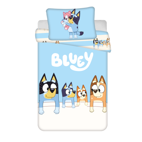 Roztomilé dětské povlečení Bluey baby s motivem oblíbených postaviček na modrém pozadí. Vyrobeno ze 100% bavlny, příjemné na dotek, s praktickým zipem. Ideální pro dětskou postýlku.