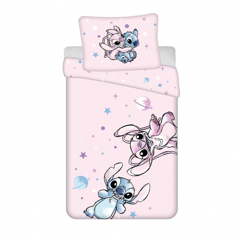 Vesmírné dětské bavlněné povlečení s motivem Stitche a Angel na růžovém pozadí s hvězdami a planetami. Jemná bavlna, praktický zip a kouzelný design pro každého malého snílka. Rozměr povlečení je 140x200, 70x90 cm.