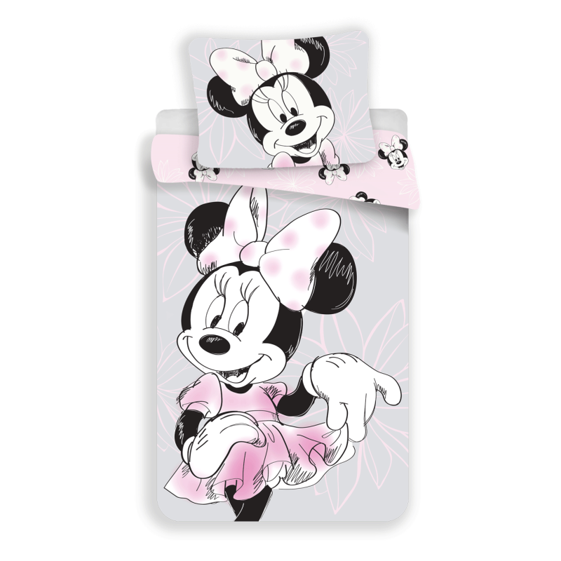 Bavlněné dětské povlečení s motivem Minnie Beautiful. Rozměr 140×200 cm/ 70×90 cm. Barevný potisk s Minnie Mouse na světle šedém pozadí s růžovými květinovými vzory potěší každého malého fanouška Minnie.
