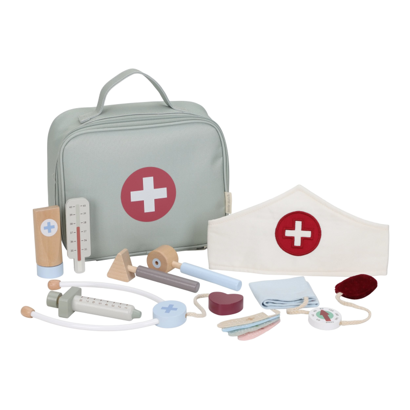 Paní doktorko, pane doktore – mohl/a byste se na mě podívat? S touto krásnou dřevěnou doktorskou sadou bude vaše dítě připravené postarat se o každého pacienta. Textilní lékařská taška ukrývá veškeré základní vybavení: teploměr, injekci, obvazy, stetoskop, tlakoměr a dokonce i doktorskou čepici.
