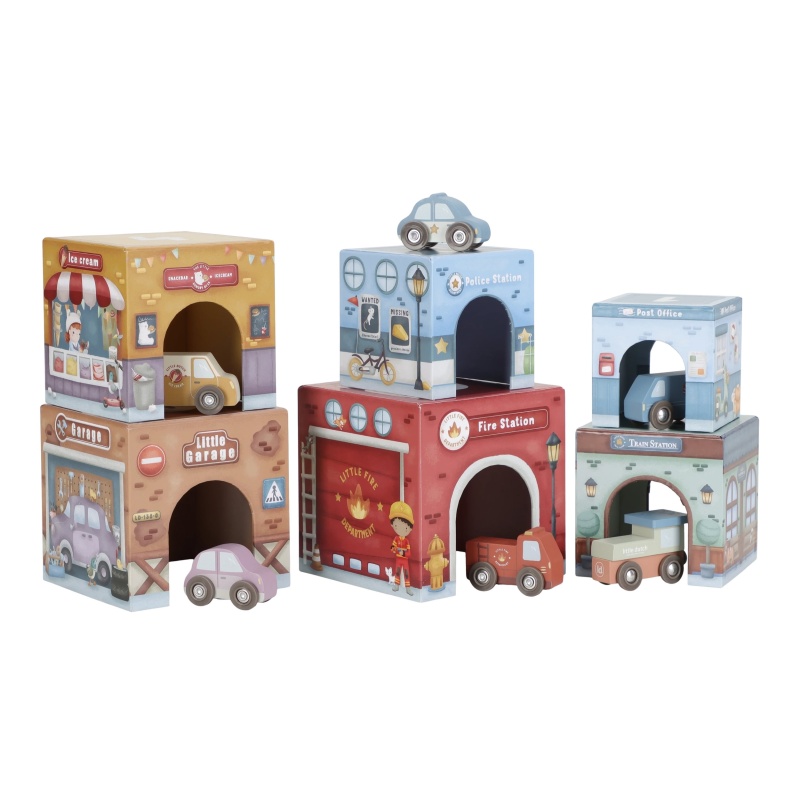 Stavět, objevovat a hrát si! Nápaditá sada Little Duch obsahuje šest ilustrovaných kartonových kostek různých velikostí, které představují budovy jako požární stanici, garáž nebo poštu – a k nim 6 dřevěných vozidel, patřících k jednotlivým budovám.