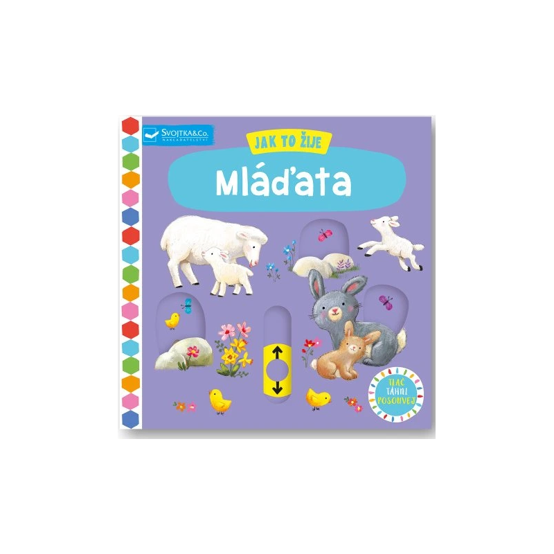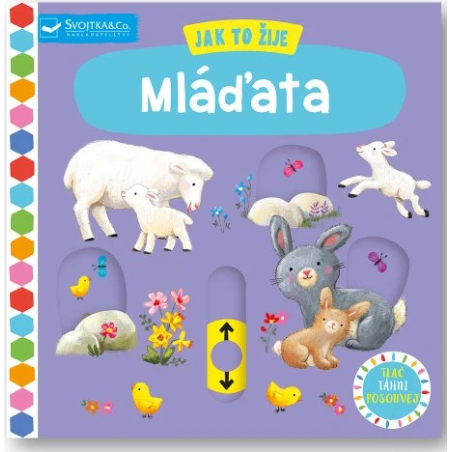 Seno je tu pro hříbátka, pro jehňátka tráva sladká. Najdeš růžového motýlka? Kuřata se klubou z vajec, štěňata se chystají spát, koťata si hrají. Prohlížej si stránky, pohybuj obrázky a uvidíš, jak to žije mezi mláďaty.