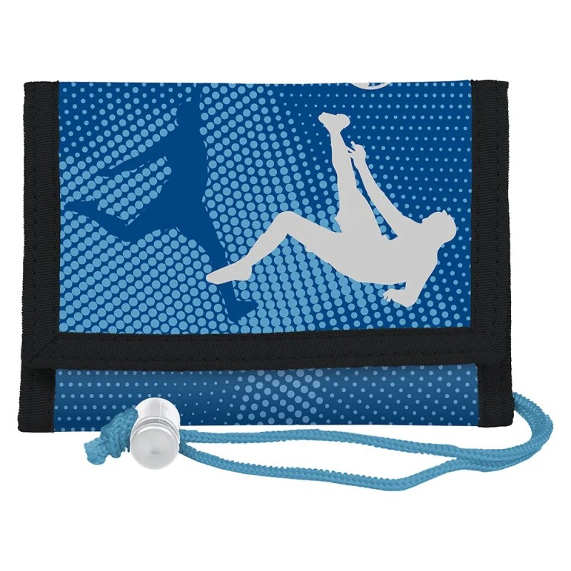 Praktická dětská peněženka na krk s motivem fotbalisty má na vnější straně průhlednou kapsičku na průkazky či karty. Uvnitř je praktický organizér s 5 kapsičkami na bankovky a drobnosti, kapsička na zip na mince a kovový kroužek na klíče.