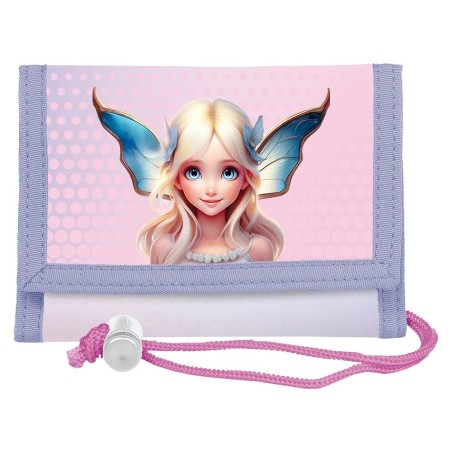Praktická dětská peněženka na krk s motivem víly má na vnější straně průhlednou kapsičku na průkazky či karty. Uvnitř je praktický organizér s 5 kapsičkami na bankovky a drobnosti, kapsička na zip na mince a kovový kroužek na klíče.