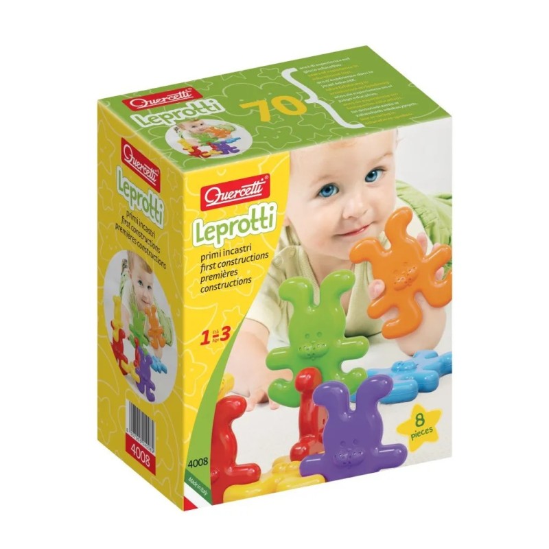 Barevné díly ve tvaru veselých zajíčků Daisy Leprotti Quercetti se různými způsoby kombinují a skládají pomocí čtyřech zasouvacích částí. Tvořivá stavebnice pro děti od 1 roku.