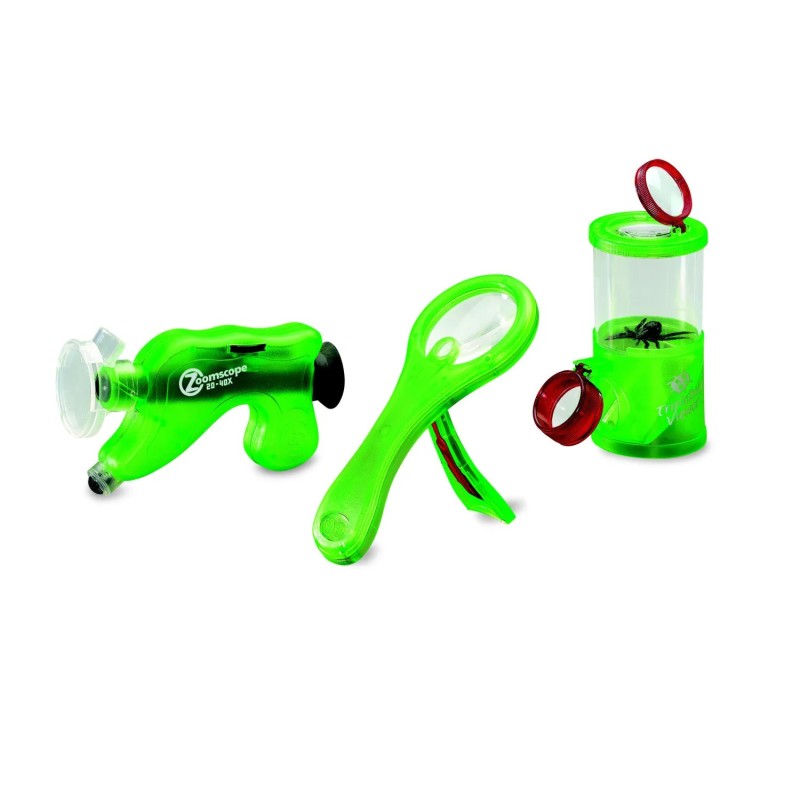 Ideální výbava pro malé badatele od 6 let je složená z kelímku na pozorování hmyzu, mikroskopu a dvojnásobné zvětšovací lupy. Děti tak mohou snadno pozorovat listy, květy, kamínky i drobný hmyz – a rozvíjet přitom zvídavost, jemnou motoriku i vztah k přírodě.