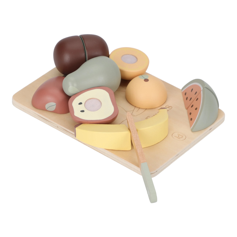 Připravte ovocnou svačinku s touto veselou sadou dřevěného krájecího ovoce! V sadě najdete šest druhů ovoce: jablko, hrušku, banán, kiwi, pomeranč a kousek melounu – každý z nich lze rozkrojit dřevěným nožíkem na dvě poloviny a díky suchému zipu je opět snadno spojíte zpět.