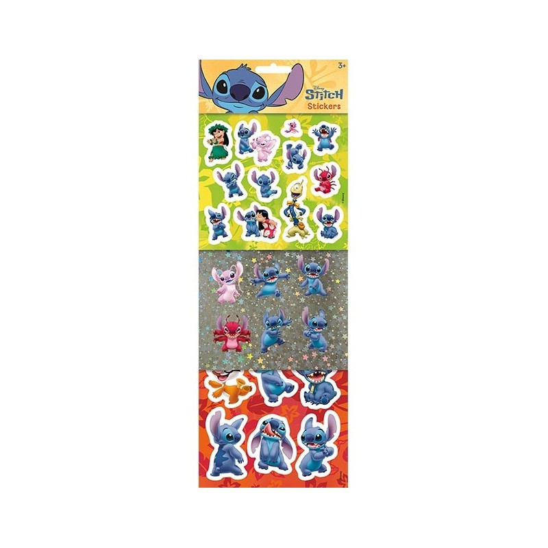Samolepkový set s motivy Lilo & Stitch obsahuje list klasických papírových samolepek, list samolepek s fóliovým efektem a list samolepek s barevnými glitry.
