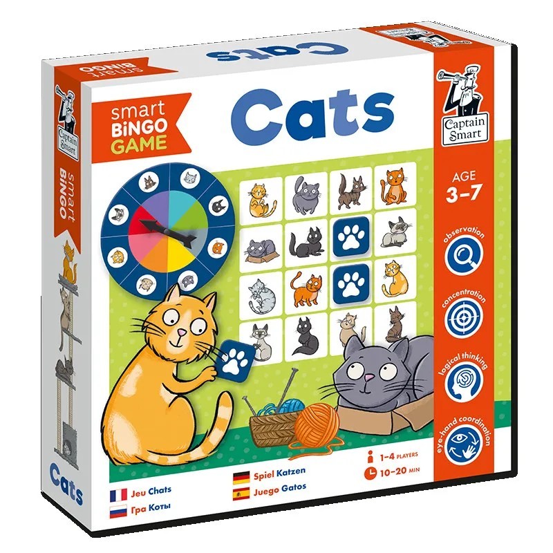 Chytré bingo pro 1-4 hráče od 3 let. Nesmíte se nechat přechytračit. Roztočte kolo, najděte hravé kočky a učte se zároveň barvy!