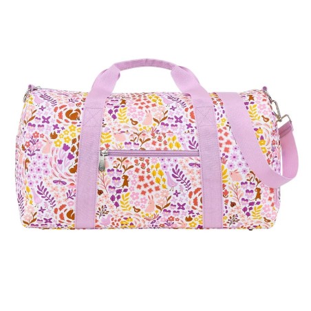Prostorná šeříková cestovní taška s květinami a liškami je ideální na dovolenou nebo jako sportovní taška na kroužek. Taška má dvě ucha do ruky a jeden nastavitelný odnímatelný ramenní popruh. Polyesterový materiál je pevný, lehký a zdobí ho barevný potisk.