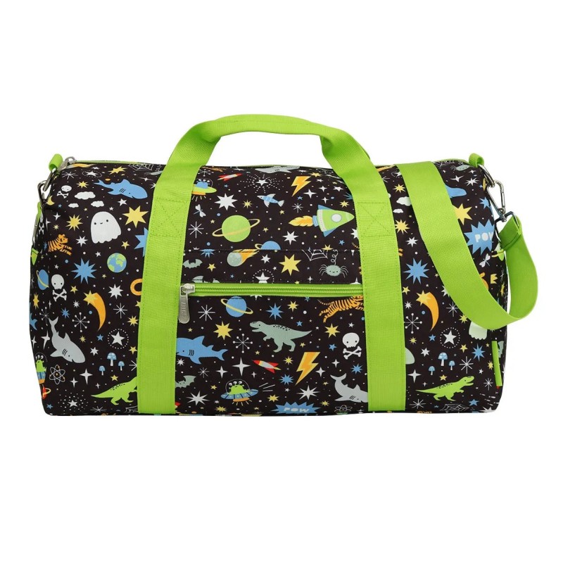 Prostorná černá cestovní taška s raketami, planetami a hvězdami je ideální na dovolenou nebo jako sportovní taška na kroužek. Taška má dvě ucha do ruky a jeden nastavitelný odnímatelný ramenní popruh. Polyesterový materiál je pevný, lehký a zdobí ho barevný potisk.