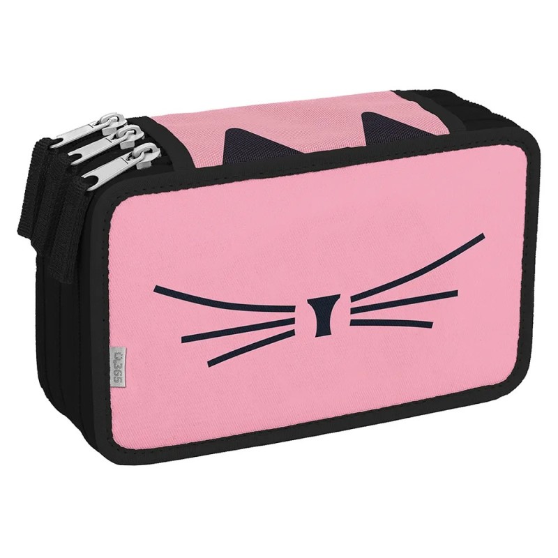Třípatrový školní penál s kočičím motivem pojme více psacích a školních potřeb. Jednotlivá patra školního penálu obsahují gumičky na pastelky a psací potřeby, místo na ořezávátko i gumu, průhlednou kapsičku na rozvrh a síťovanou kapsičku na drobnosti.