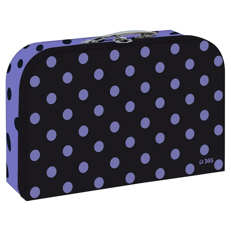 Dětský kufřík je vhodný pro uložení výtvarných potřeb či jiných pomůcek ve škole i doma. Školní kufřík je velmi lehký, vyrobený z kvalitní lepenky. Vnější strana je pokryta potištěným papírem s motivem puntíků.