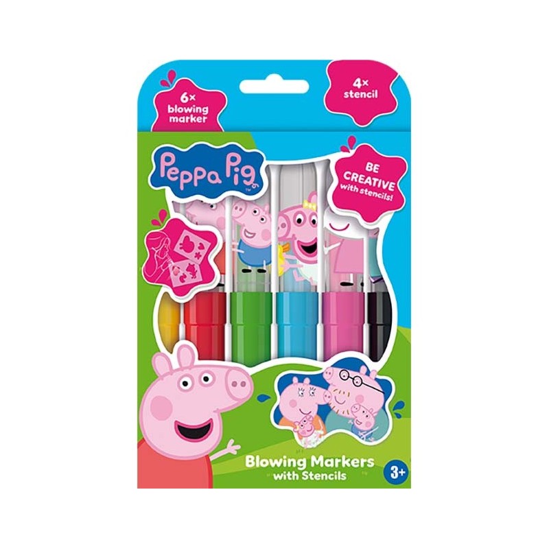 Foukací fixy jsou oblíbenou kreativní aktivitou malých dětí. Děti mohou své výtvory vytvářet pomocí přiložených šablon nebo dle své fantazie. Balení obsahuje 6 barevných foukacích fixů a 4 barevné papírové šablonky v oblíbených motivech Peppa pig.