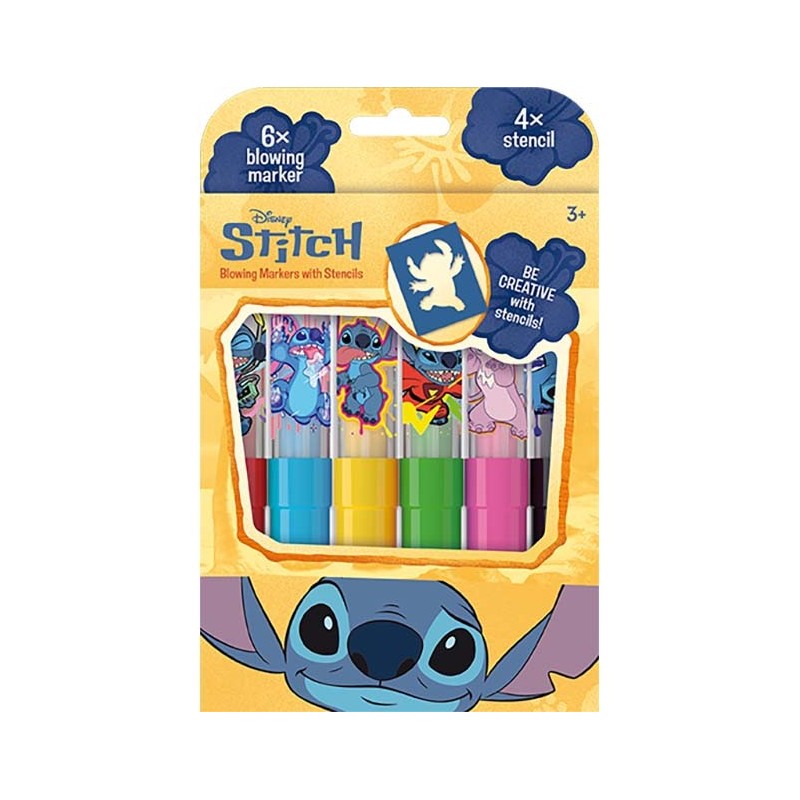 Foukací fixy jsou oblíbenou kreativní aktivitou malých dětí. Děti mohou své výtvory vytvářet pomocí přiložených šablon nebo dle své fantazie. Balení obsahuje 6 barevných foukacích fixů a 4 barevné papírové šablonky v oblíbených motivech Lilo & Stitch.