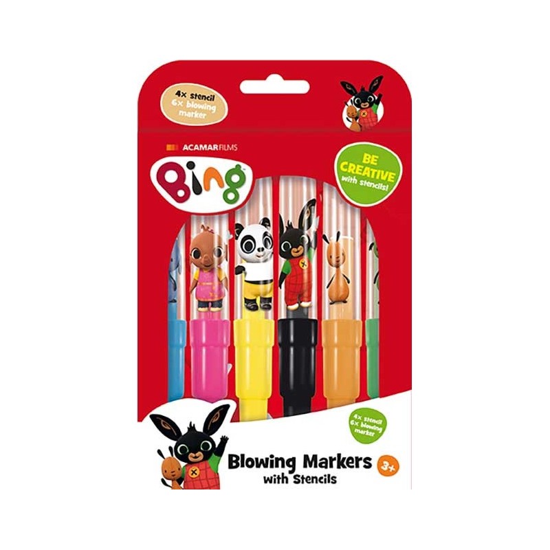 Foukací fixy jsou oblíbenou kreativní aktivitou malých dětí. Děti mohou své výtvory vytvářet pomocí přiložených šablon nebo dle své fantazie. Balení obsahuje 6 barevných foukacích fixů a 4 barevné papírové šablonky v oblíbených motivech Binga.