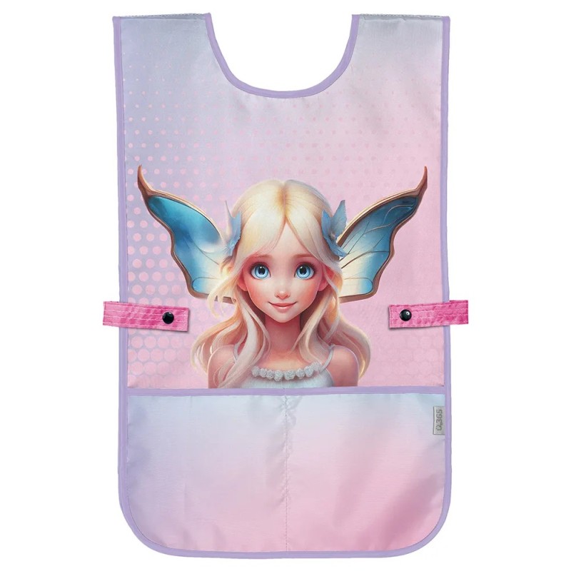 Zástěrka na výtvarnou výchovu s motivem víly je zapínatelná na praktické druky. Dítě nemusí zástěrku zavazovat na zádech, druky si snadno nastaví velikost kolem pasu a zároveň má díky novému střihu chráněnou větší část těla.
