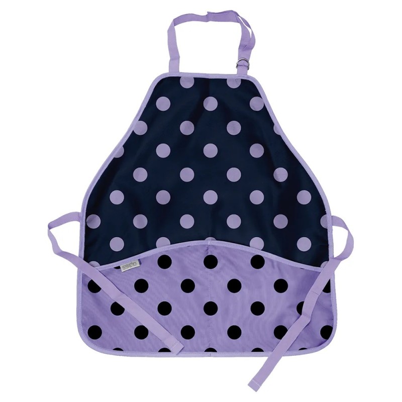 Zástěrka na výtvarnou výchovu se navléká nastavitelným popruhem přes hlavu a zaváže se kolem těla pomocí šňůrek. Zástěrka na tvoření s motivem puntíků je vyrobena z omyvatelného polyesterového materiálu, který se lehce udržuje.